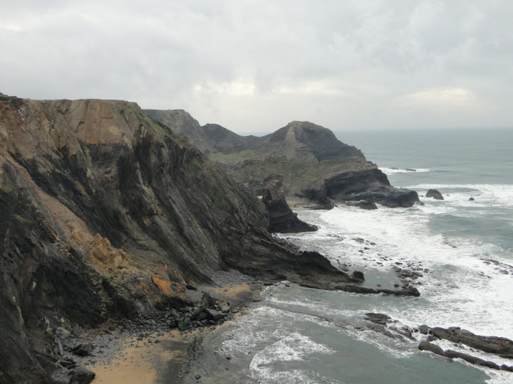 Steilküste Gestern haben wir vom Meer nicht viel gesehen. Heute geht unsere Straße zumindest die ersten 15 km direkt am Meer entlang. Wir kommen einen ersten Vorgeschmack was uns an der Algarve erwartet. Die ersten Felsen und kleine Steilküsten heben sich aus dem Meer. Dann führt uns die Straße wieder von der Küste weg. Wir radeln an Wiesen und Feldern vorbei und sehen in der Ferne die Berge der Hochalgarve. 30 km weiter kommen wir wieder an die Küste. Die Steilküste ist schon deutlich höher geworden. Scharfe Gesteinskanten ragen ins Meer. Die einzelnen Gesteinsschichten sind sehr gut zu erkennen. Als wir ein drittes Mal noch ein Stück weiter wieder die Küste sehen, fällt diese jetzt schon ca. 50 Meter senkrecht zum Meer ab. Der Anblick erinnert ein bisschen an die Nordküste von Irland. Das Meer schlägt tief unten an die Felsen, die Sonne neigt sich schon stark zum Horizont. Wieder mal geht ein sehr schöner Radtag langsam zu Ende. |