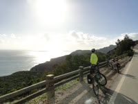 Serra da Arrábida Von Setúbal machen wir einen kleinen Ausflug ohne Gepäck in die Serra da Arrábida. Wir müssen nur 5 km aus der Stadt herausradeln und sind in einer anderen Welt. Wir stehen in einer Bucht mit feinstem Sandstrand, eingerahmt von Felsen, Palmen und Kakteen. Hinter uns ragen 300 bis 500 Meter hohe Berge empor, der Himmel ist blau und die Sonne scheint. So sitzen wir eine Weile am Strand, denken an zu Hause und das Weihnachten dieses Jahr so anders wird. Wir radeln weiter an der Küste entlang. Die Straße steigt steil an erst auf 250 Meter dann weiter auf 400 Meter. Wir kommen richtig ins Schwitzen und sind froh, daß wir das Gepäck nicht mit dabei haben. Die Aussicht ist wieder mal vom Feinsten. Wir sehen auf die kleinen Buchten, das Meer und die umliegenden Berge. Selbst ein Stück Steilküste können wir sehen. Auf dem höchsten Punkt eröffnet sich auch der Blick auf die andere Seite des Bergkamms und wir sehen Lissabon in der Ferne. Dann geht es mit einer rasanten Abfahrt nach unten. Morgen werden wir das Rad stehen lassen, um mit dem Bus nach Lissabon zu fahren. |