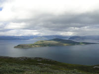 Alpen Auf der Fähre und auf den ersten Kilometern können wir rückblickend noch die grandiosen Lyngener Alpen sehen. Als Alpen werden sie bezeichnet und brauchen mit den richtigen Alpen keinen Vergleich scheuen. Hochalpines Feeling gibt es hier schon knapp über Meereshöhe. Diese Berge vermitteln noch den Eindruck von Unbezwingbarkeit, so steil fallen viele zu allen Seiten ab. Gletscher und Schnee gibt es schon ab 1000 m. Auf der anderen Seite des Fjords geht es nicht mehr ganz so dramatisch zu. Auf der E8 haben wir viel Verkehr und ein starker Gegenwind macht die Fahrt beschwerlich. Ein Pausenplätzchen ist auch nicht zu finden. Links und rechts sind Leitplanken. Wir sind froh, Tromsö zu erreichen. Mit übermäßiger Schönheit glänzt auch diese Stadt nicht, aber es gibt alles, was man so braucht. Danach wird es schnell wieder ruhiger und landschaftlich interessant. Die Suche nach einem Übernachtungsplatz gestaltet sich trotzdem schwierig. So radeln wir viel weiter als gewollt, bis wir ein schönes Plätzchen leicht erhöht an einem Fjord finden mit überragender Aussicht. Das Essen ist schnell gekocht und wir verkriechen uns schnell in unsere Schlafsäcke. Es ist immer noch ordentlich kalt. |