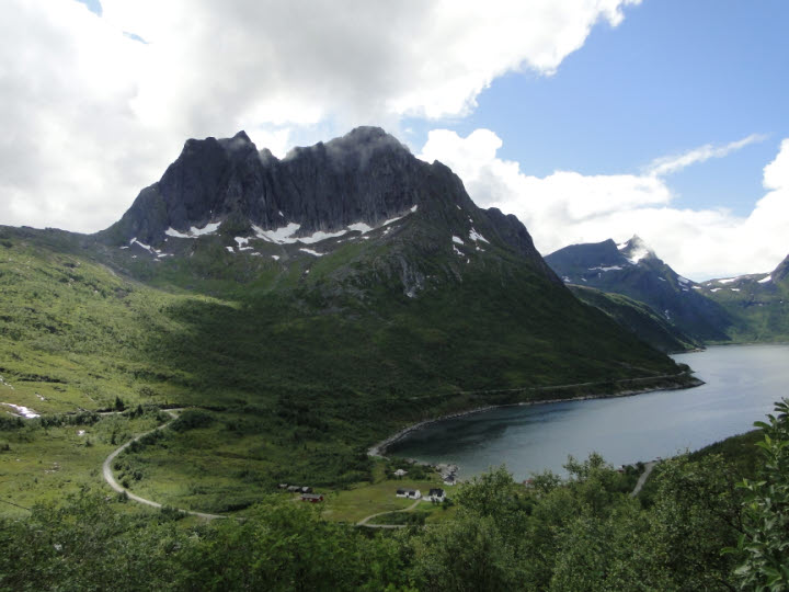 Lila Nach wenigen Kilometern bleiben wir am Straßenrand stehen, um ein Foto zu machen. Da tritt ganz unerwartet ein Mann aus den Büschen und winkt uns mit einem Eimer in der Hand zu. Wir winken zurück und warten ab. Der Mann kommt mit seinem Eimer auf uns zu und bietet uns gerade frisch gepflückte Multebeeren an. Die Beeren schmecken nicht schlecht. Der Straßenrand ist heute mit lila Blumen gesäumt. Die Berge sind nicht ganz so hoch, etwas runder und grün bewachsen. In unserem norwegischen Lieblingsmarkt einem REMA 1000 erledigen wir die täglichen Besorgungen. Wir nähern uns langsam den Lofoten. Die Berge auf der anderen Seite des Fjords werden wieder steiler und größer. An der Fähre in Melbu treffen wir Johannes wieder. Die Lofoten beginnen spektakulär. Wir radeln durch ein schmales Tal/ Fjord mit senkrecht aufragenden Bergen links und rechts. Hier sollte sich doch ein schöner Platz zum Übernachten finden lassen. Wir fragen zunächst an einem Haus nach Wasser. Im Vorbeifahren haben wir schon eine Landzunge entdeckt, die sich anbieten würde, sind uns aber nicht sicher, ob es sich dabei um ein Privatgrundstück handelt. Zufällig kommt die Eigentümerin mit ihrem Auto an uns vorbei. Wir fragen, ob wir auf ihrem Grundstück das Zelt aufschlagen dürfen. Es ist kein Problem. Kurze Zeit später kommt sie bei uns vorbei und erkundigt sich, ob alles in Ordnung sei, dann fährt sie mit ihrem Mann zum Fischen raus. Als sie wieder kommen, schaut sie ein zweites Mal vorbei und bietet uns an, bei ihr im Haus zu schlafen. Sie habe Angst, dass es uns draußen zu kalt werden könnte. Wir lehnen zwar ab, finden es aber trotzdem großartig. |